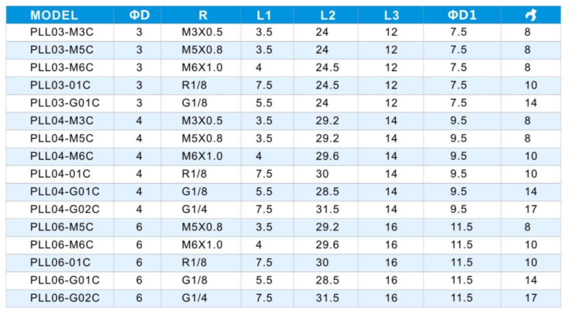 PLL - C Elongated Elbow Pneumatic tubing fitting SMC type Mini Size
